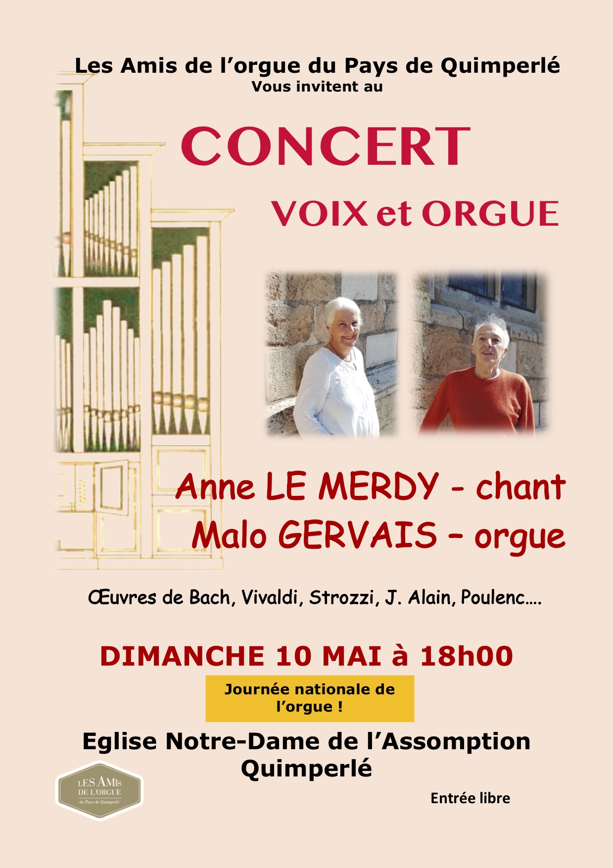Dans le cycle des concerts mensuels du dimanche organisés par les Amis de l'orgue, l'église Notre Dame de l'Assomption de Quimperlé accueillera le duo Anne Le Merdy - mezzo-soprano et Malo Gervais - orgue, dimanche 10 mai à 18h.