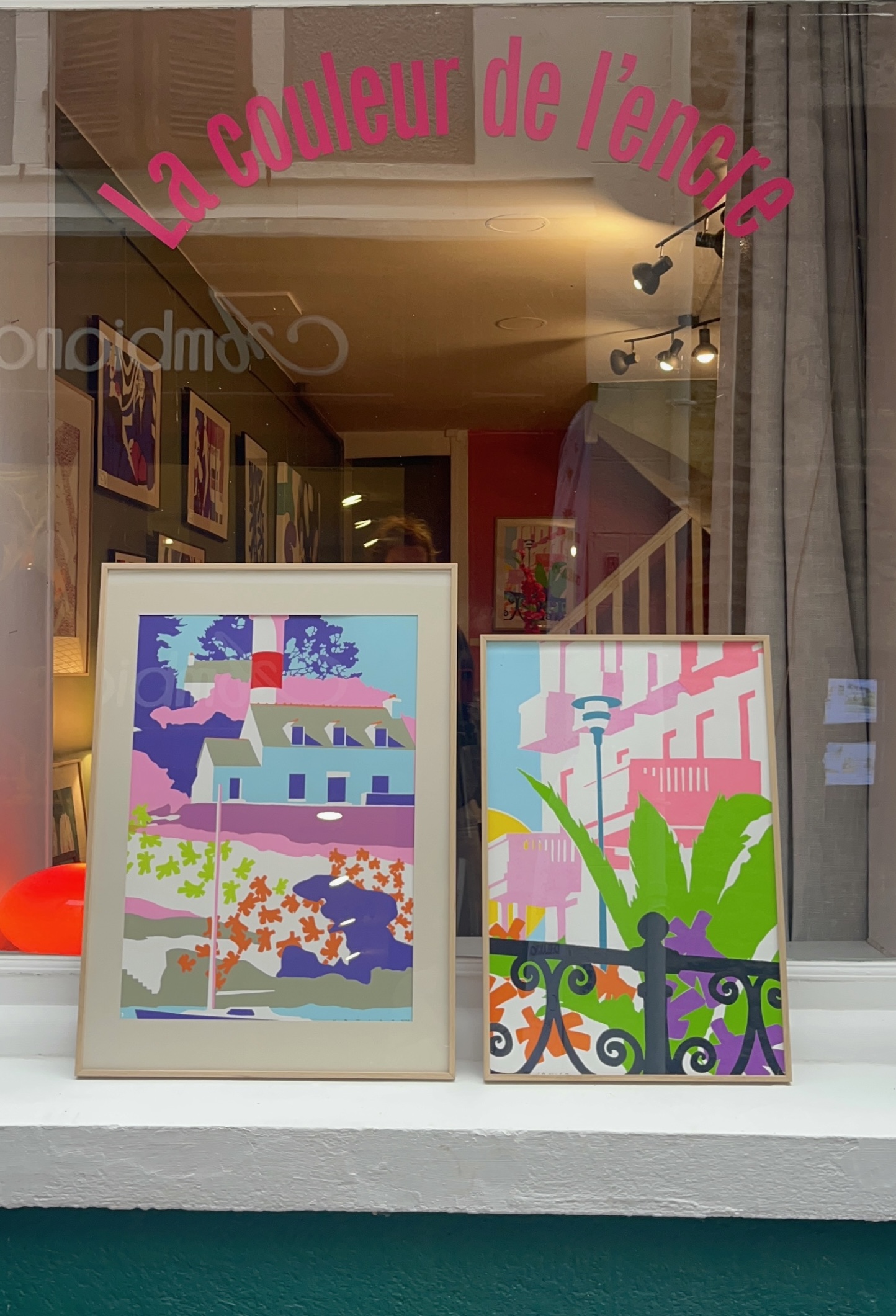 Je pratique la sérigraphie artisanale à Quimperlé, sur textile et papier. Mon travail s’inscrit dans la tradition de la sérigraphie à la lyonnaise, une technique d’impression au cadre plat historiquement utilisée pour l’impression de longueurs de tissu.